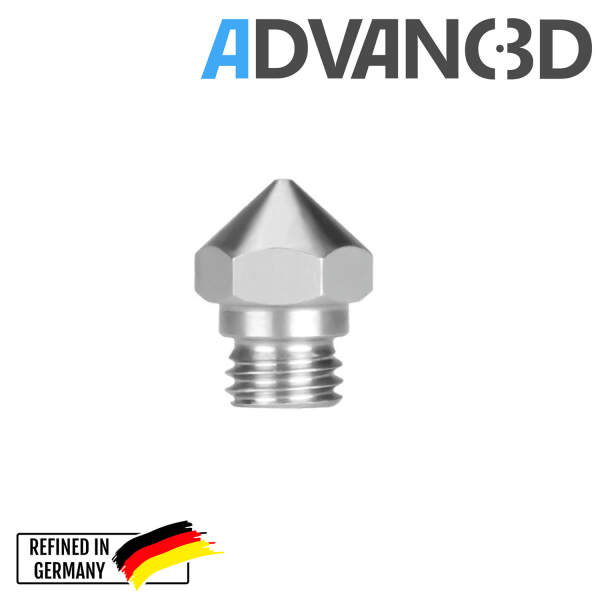 Die Advanc3D MK10 Nozzle aus Edelstahl X 8 CrNiS 18 9 bietet eine exakte Filamentführung bei 1.75mm Druckmaterial. Mit der 0.4mm Öffnung wird eine gleichmäßige Schichtqualität erreicht, die für detailreiche 3D-Drucke entscheidend ist.