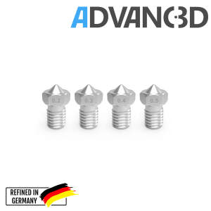Dank des gehärteten Stahls widersteht die Düse abrasiven Filamenten wie Carbon- oder Glasfaserfilament. Die Advanc3D Düse behält ihre Form und Maßhaltigkeit auch nach intensiver Nutzung über einen langen Zeitraum.